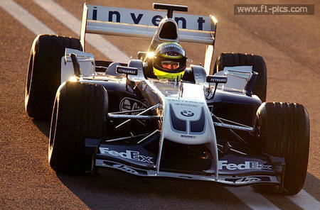 BMW Williams F1 German driver Ralf Schumacher drives his new FW26 race car during a test session in Valencia, Spain, Monday, Jan. 5, 2004. (AP Photo/Ramon Espinosa)