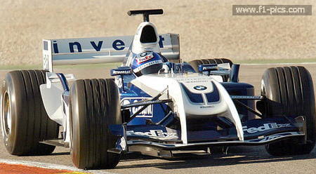 BMW Williams F1 Colombian driver Juan Pablo Montoya drives his new FW26 race car during a test session in Valencia, Spain, Monday, Jan. 5, 2004. (AP Photo/Ramon Espinosa)
