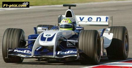 BMW Williams F1 German driver Ralf Schumacher drives his race car during a test session at Montmelo race track in Barcelona, Spain, Tuesday, Feb. 3, 2004. (AP Photo/Bernat Armangue)