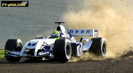 German Formula One driver Ralf Schumacher, of the Williams team, runs off the track during a test run at the Montmelo racetrack outside of Barcelona, Spain, Tuesday Feb. 3, 2004. (AP Photo/EFE, Andreu Dalmau)