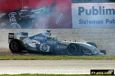 Germany's Ralf Schumacher's Williams BMW Formula-1 car breaks down after he spun off a curve during a training session at the racetrack near Jerez de la Frontera in southern Spain, Wednesday, Feb. 11, 2004. (AP Photo/Raul Diaz)