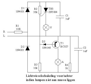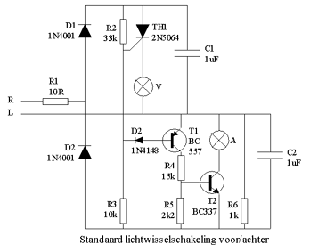 Heb je 2 lampen (voor/achter), maar kun je ze vrij aansluiten, dan kun je T2 en de weerstanden R4/R5 weglaten. Het is wel raadzaam T1 dan te vervangen door een bc327. Kan voldoende stroom leveren voor 2 lampen