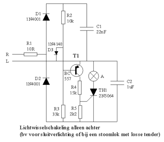 Wil je alleen koplampen voor schakelen (bv aan voorzijde van een stoomlok met losse tender) dan wordt het nog iets simpeler. De schakeling is eigenlijk alleen de bovenste helft van de volledige schakeling, aangezien je het negatieve deel hier niet nodig hebt, behalve C2 uiteraard. C2 is weer aanzienlijk kleiner omdat deze geen stroom hoeft te leveren aan lampen. Overigens zou ik de koplampen van een lok met losse tender niet schakelen. Een lok met sleeptender rijdt in principe alleen vooruit, behalve bij rangeren en in dat geval neem ik het voor lief dat de koplampen gewoon blijven branden en alleen de 'achterlichten' schakelen. Je kunt de schakeling echter ook gebruiken wanneer je alleen sluitverlichting wilt schakelen of wanneer je alleen achterlichten wilt schakelen waarbij de lampen niet aan massa liggen. Om eze reden kun je de schakeling toch vrij veel toepassen en het voordeel is: hij is lekker