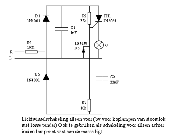 Wil je alleen koplampen achter schakelen (bv in de tender van een stoomlok) dan kun je gebruik maken van de volgende schakeling. De Thyristor zit nu aan de negatieve kant. Het weerstandsnetwerkje R2/R3 zorgt ervoor, in combinatie met T1, dat TH1 alleen ontstoken wordt als de negatieve periode het eerst verschijnt. Is de eerste periode positief dan is C1 al opgeladen en zal T1 nooit tot geleiding komen. Merk dat C2 nu aanzienlijk kleiner is, immers C1 hoeft geen stroom te leveren. De waarde van C1 is zo gekozen dat deze gedurende enkele periodes leegloopt via