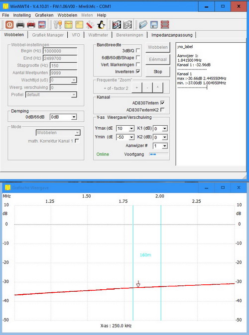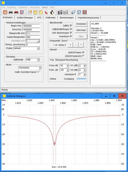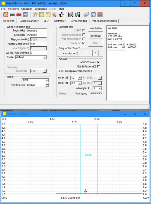 | De plaatjes van mijn FA-NWT-01 voor SWR en de reflectiedemping. |