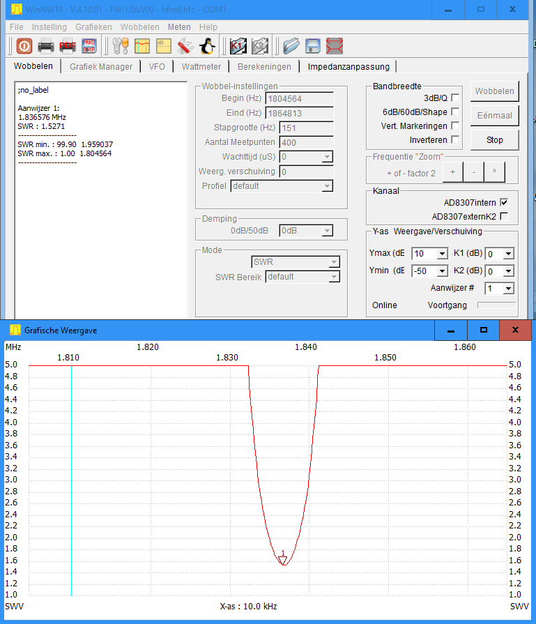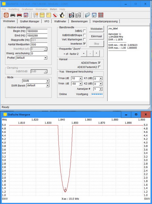 | Wat opmerkelijk is: Het op de frequentie brengen van deze E-veld antenne, door de lengte van de bovenste spriet te wijzigen, gaf met behulp van de FA-NWT01 Analyzer een minimale SWR bij 1,8415 MHz. In de praktijk bleek later dat de SWR bij deze frequentie nog te hoog was, namelijk 1: 1,6. In de FT8 mode van de FTdx3000 is met het programma WSJTX het audio bandje zo'n 3 kHz breed. Met de interne SWR meter van de FTdx3000 werd vastgesteld dat bij zenden de laagste SWR nog ruim voorbij deze 3 kHz lag. M.a.w. de optimale frequentie van de E-veld antenne lag nog te hoog! Daarom werd nu stapsgewijs de spriet op de antenne uitgeschoven en de SWR gemeten. Bij de frequentie van 1,8415 MHz en een sprietlengte van 27 cm was de SWR minimaal: 1: 1,2. De zo geoptimaliseerde antenne werd weer aangesloten op de FA-NWT01 en later ook op de SAA-2N Analyzer. Daarbij bleek dat de minimum SWR nu bij de frequentie van 1,836 MHz te liggen. Dus zo'n 5 kHZ te lager(zie figuur 8)! |